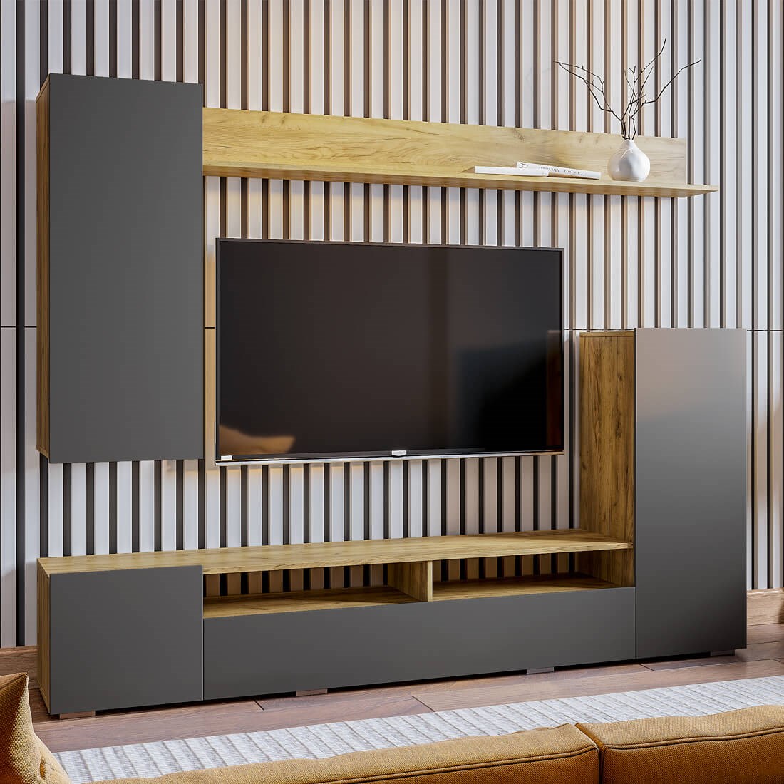 Стильный вариант гостиной Диаманд будет прекрасно смотреться в любом интерьере. Фасады без ручек и лишнего декора выглядят современно. На верхней открытой полке вы сможете разместить свои любимые сувениры или фотографии.