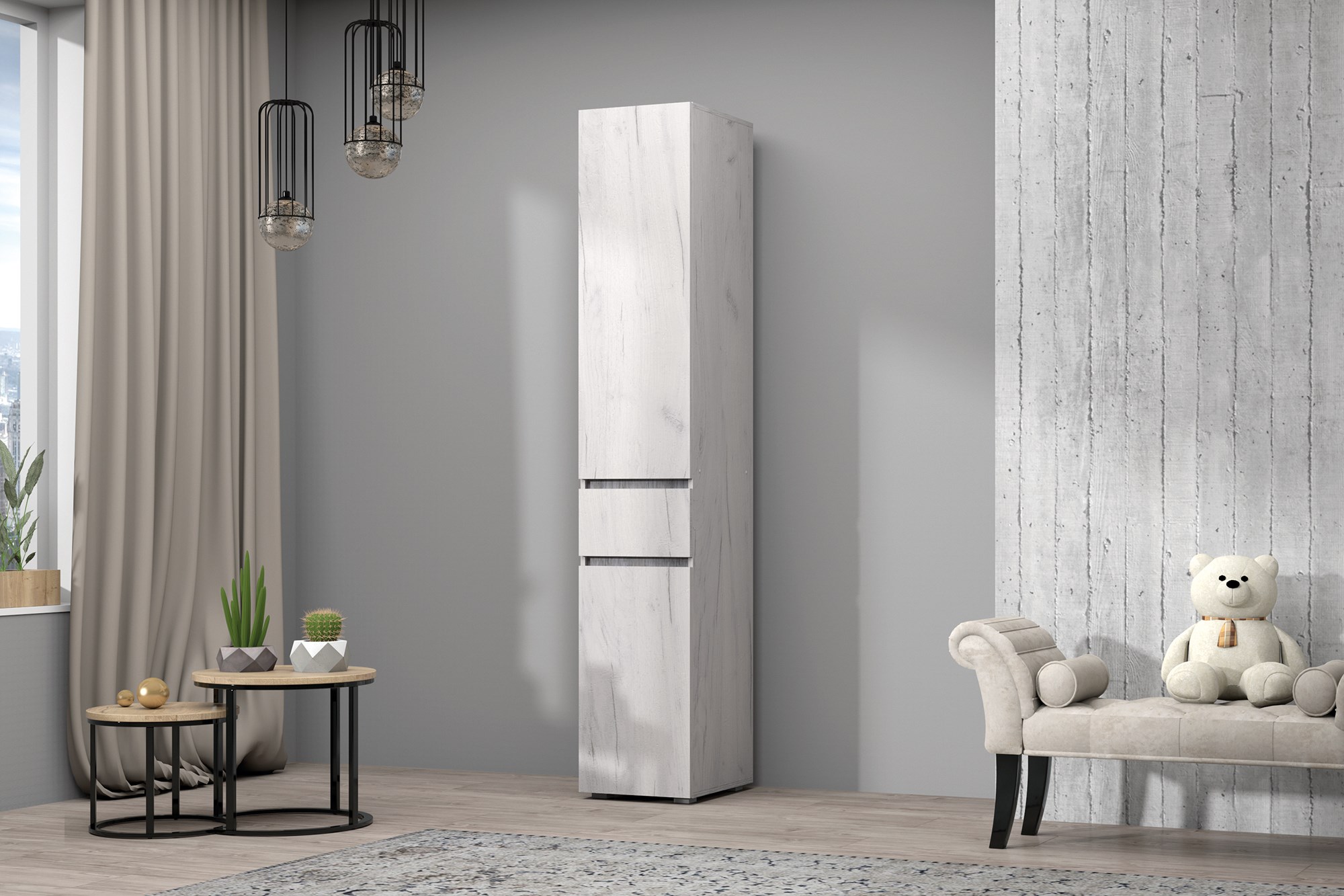 Пенал данной модульной гостиной включает в себя распашные дверцы, скрывающие удобные для пользования полки, и выдвижной ящик глубиной 400мм на шариковых направляющих полного выдвижения.