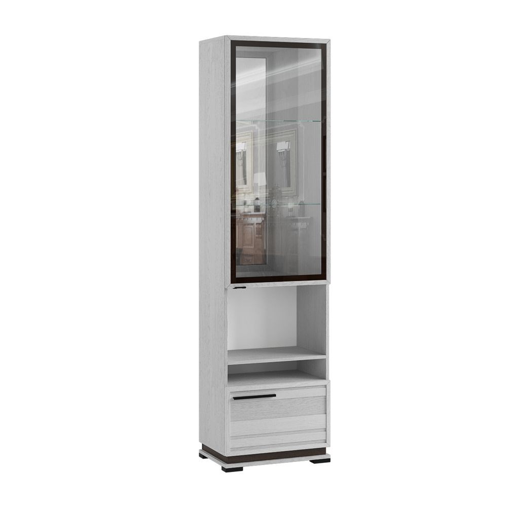 Пенал со стеклом — отличный вариант для хранения посуды и интерьерных вещиц. За бесцветным стеклянным фасадом, украшенным фотопечатью, две стеклянные полки. Задняя стенка витрины — зеркало. Нижний откидной рамочный фасад украшен планками из МДФ разной ширины, которые придают модели неповторимый стиль.
