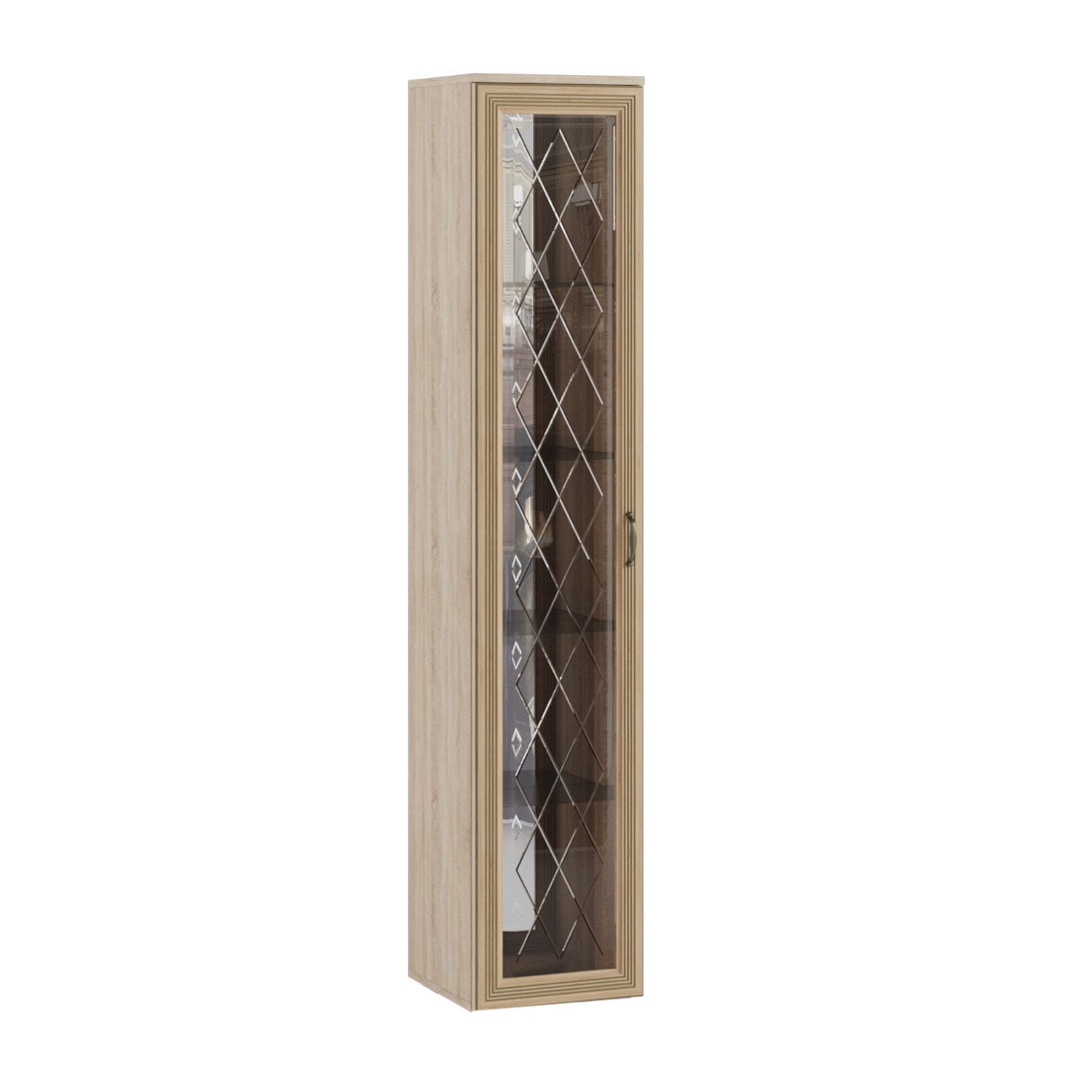 Пенал-витрина (надстраиваемый), как следует из названия, располагается на тумбе для ТВ-техники. Данный модуль выполняет в первую очередь декоративную функцию. На стеклянных полках можно хранить книги, фотографии, памятные вещи. Рамочный профиль с патиной, создающей эффект искусственного старения, стекла с фацетной обработкой и гравированным геометрическим узором притягивают взгляд. Внутренняя стенка витрины имеет зеркальную поверхность. Специальная защитная пленка с оборотной стороны делает зеркало прочным и безопасным, и даже если стекло разобьётся, оно не осыплется. Сборка пенала-витрины универсальная — его можно собрать как на правую, так и на левую сторону.