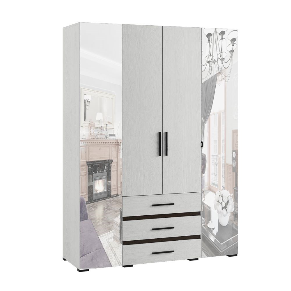 Вместительный распашной шкаф, функциональное наполнение которого разделено на симметричные половины, что очень удобно для зонирования гардероба. За глухими распашными фасадами скрывается стационарная металлическая штанга, за зеркальными — отделения с четырьмя полками. Три вместительных ящика для хранения белья установлены на шариковые направляющие полного выдвижения. Элегантная накладная ручка позволит открывать дверцу левой и правой секций, не прикасаясь к зеркальному полотну, а, значит, его не придется часто протирать.
