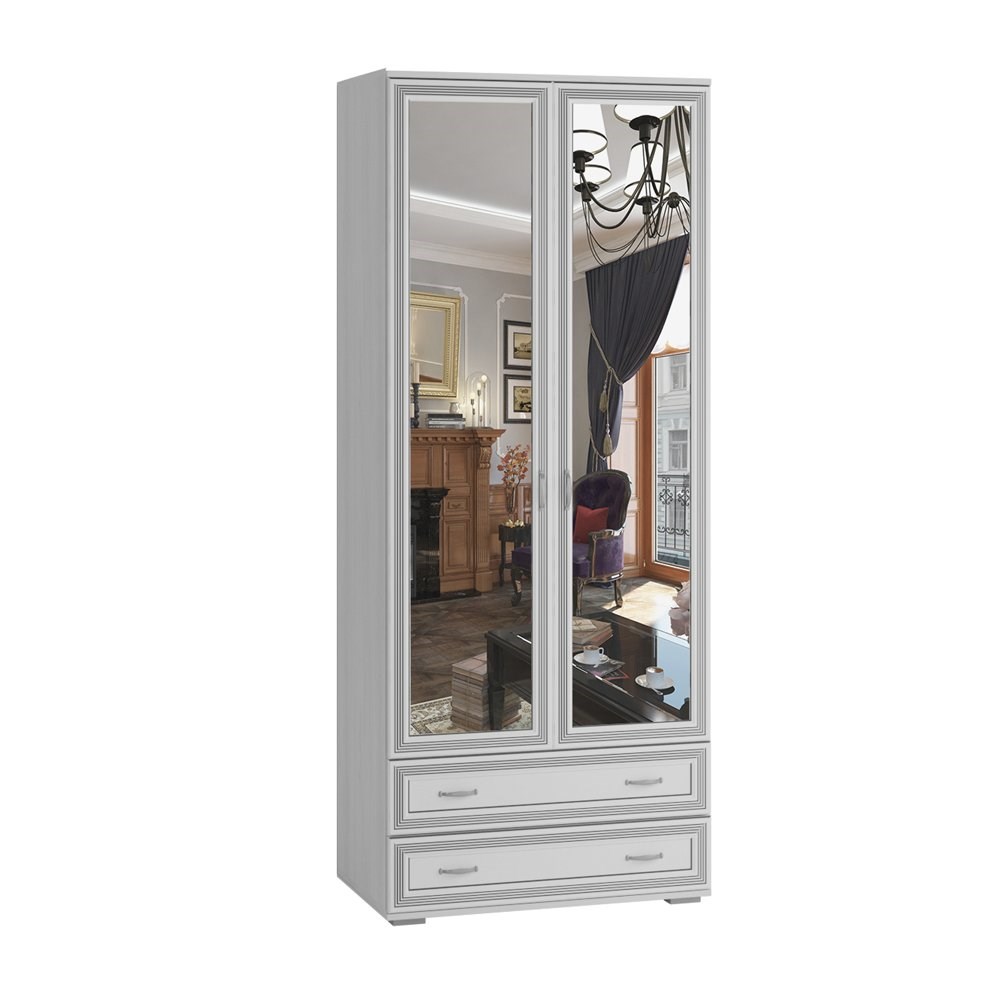 Двухдверный шкаф с зеркальными фасадами и ящиками полного выдвижения идеально впишется в любую шкафную группу. Стационарная металлическая штанга позволит разместить весь верхний гардероб семьи. Зеркала с тыльной стороны проклеены специальной защитной пленкой, которая надежно предотвращает возможное распространение осколков от стекла в случае его повреждения.