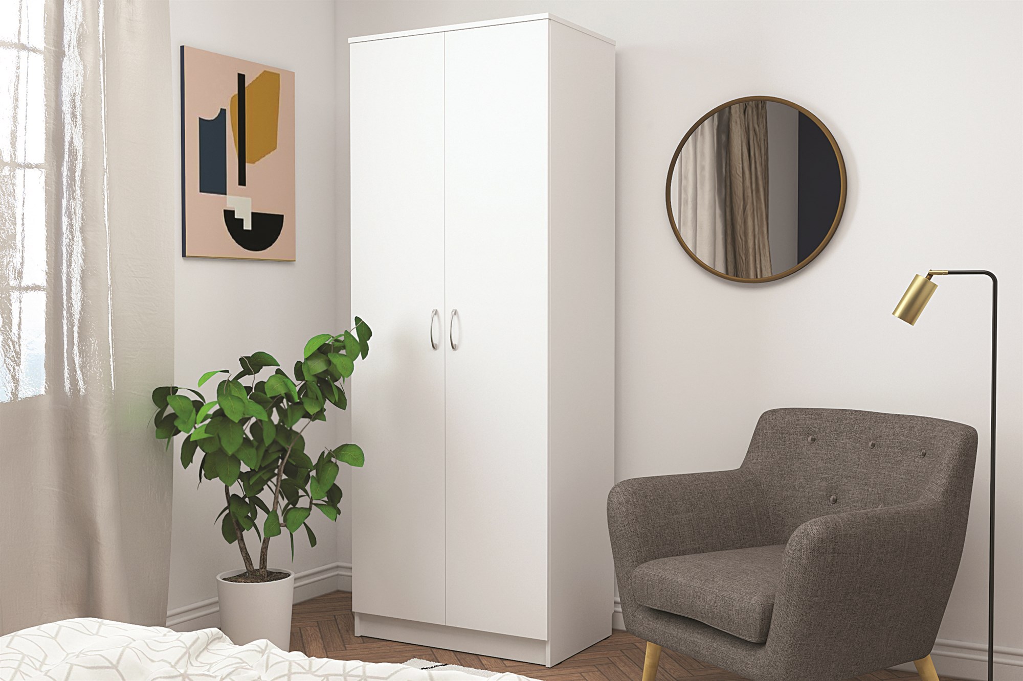 - Шкаф 2-х створчатый имеет: 2 большие полки и перекладину под плечики. Объем шкафа 635 литров.