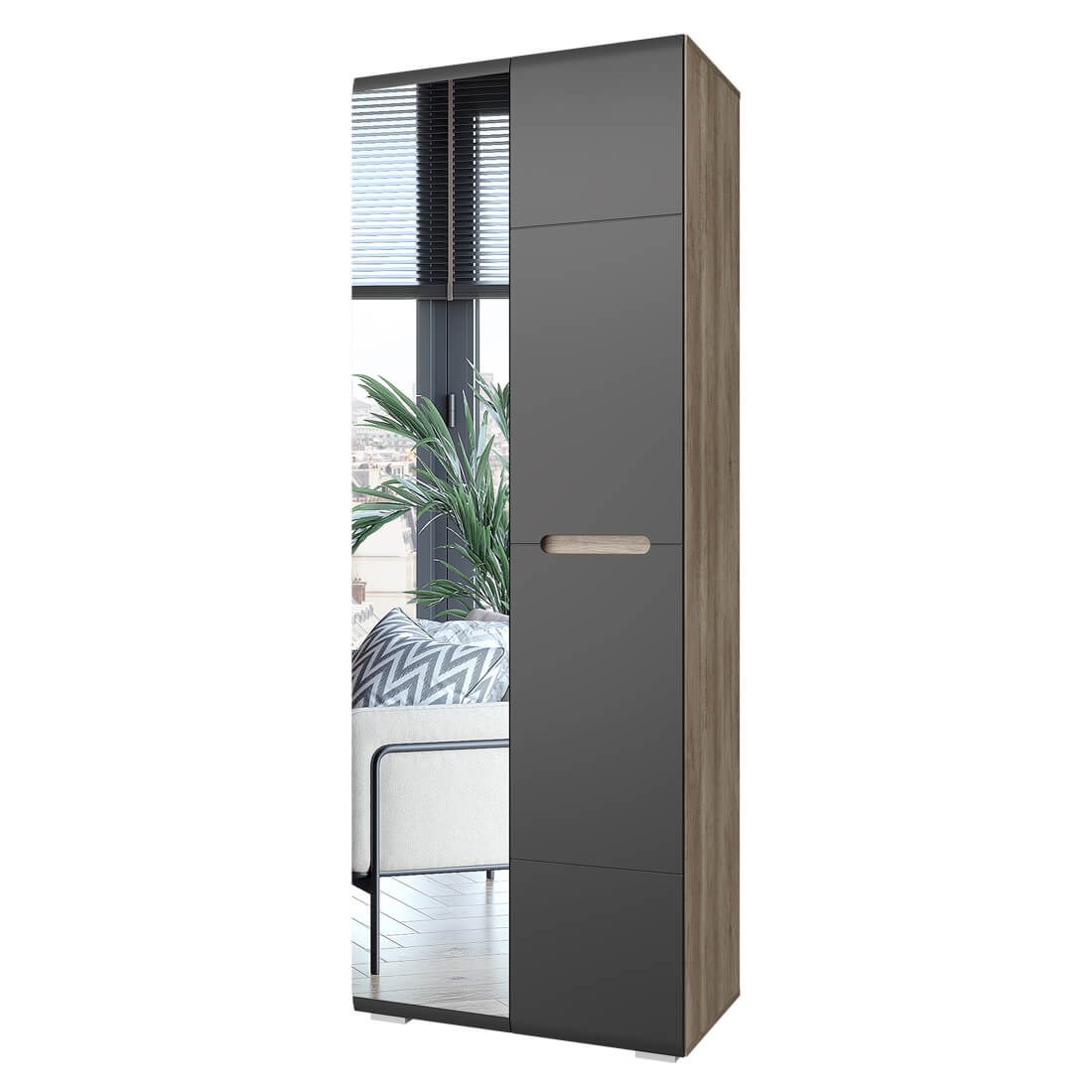- модель имеет две распашные створки, одна из них полностью зеркальная, а вторая – темного серого и белого цвета с интегрированной ручкой,
