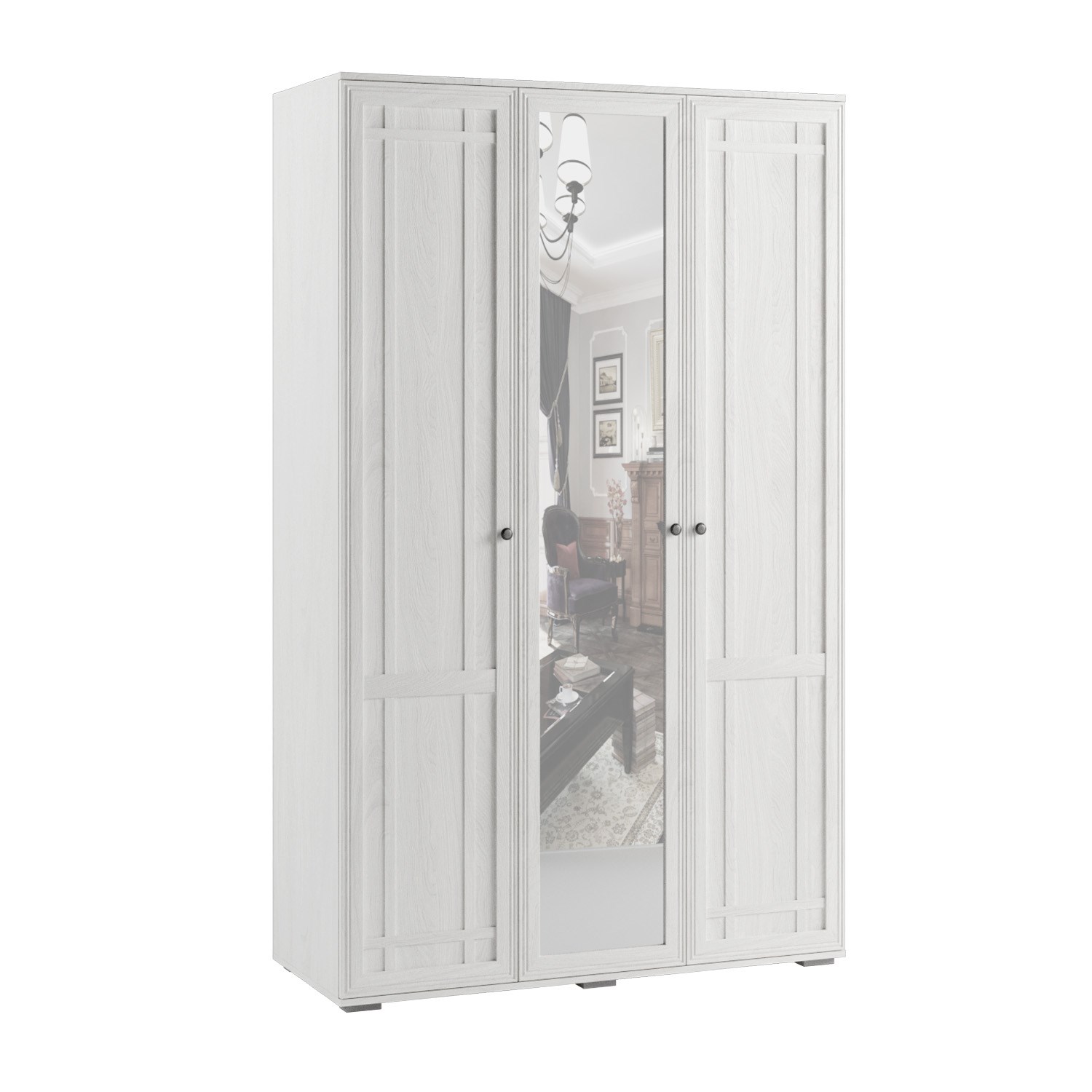 Функциональный трехдверный шкаф, который условно можно разделить на две секции: небольшой отсек с четырьмя полками для хранения белья в левой части и вместительный, оснащенный стационарной металлической штангой отсек по центру. Распашные глухие дверцы шкафа декорированы раскладками. Зеркальный фасад проклеен с тыльной стороны надежной защитной пленкой, которая в случае повреждения зеркала сохранит каждый его кусочек. Аккуратная рама из патинированного профиля МДФ по периметру фасада не делит отражение и позволяет увидеть себя в полный рост без помех.