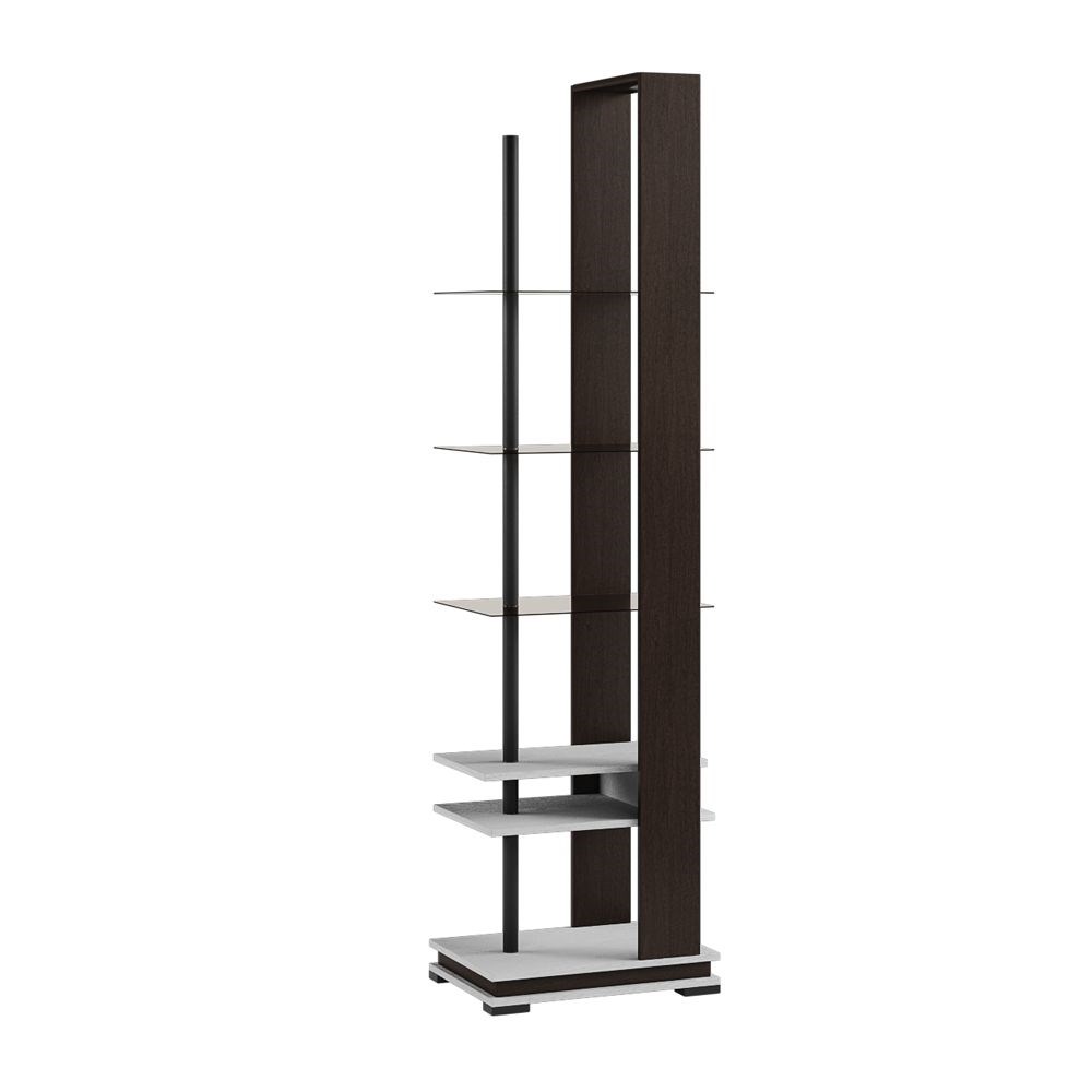 Стильный стеллаж с открытыми полками не займёт много свободного места, но станет необычным акцентом в интерьере. Комбинация тонированных стеклянных полок с элементами из ЛДСП и металла — изюминка модуля.