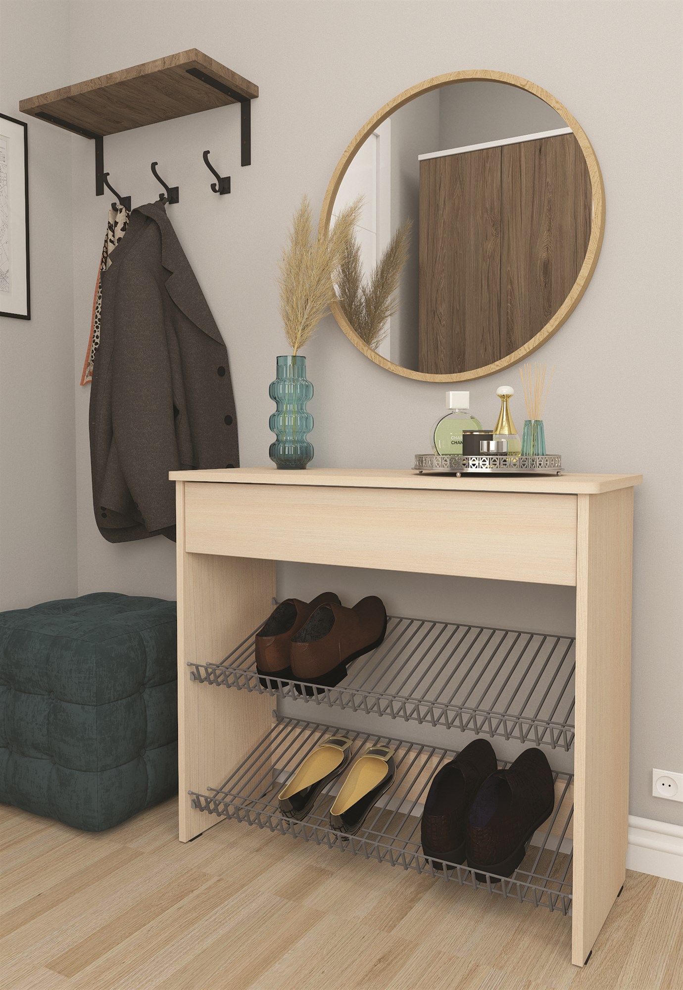 - Небольшая тумба с 2-ми металлическими полками для хранения обуви и выдвижным ящиком для вещей.